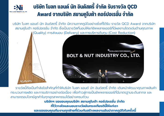 บริษัท โบลท แอนด์ นัท อินดัสตรี้ จำกัด มีความภาคภูมิใจอย่างยิ่งที่ได้รับ รางวัล QCD Award จากบริษัทสยามคูโบต้า คอร์ปอเรชัน จำกัด ซึ่งเป็นรางวัลที่มอบให้แก่ชัพพลายเออร์ที่มีผลงานโดดเด่นด้านคุณภาพ (Quality) การส่งมอบ (Delivery) และการบริหารต้นทุน (Cost Reduction)
